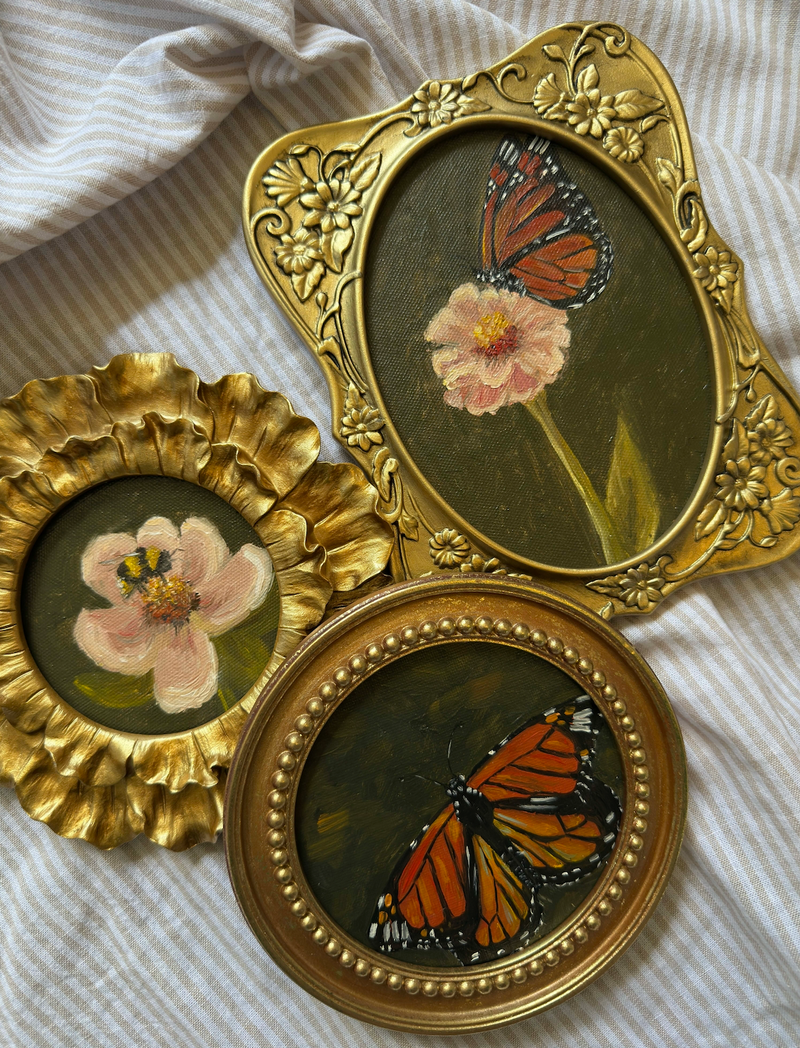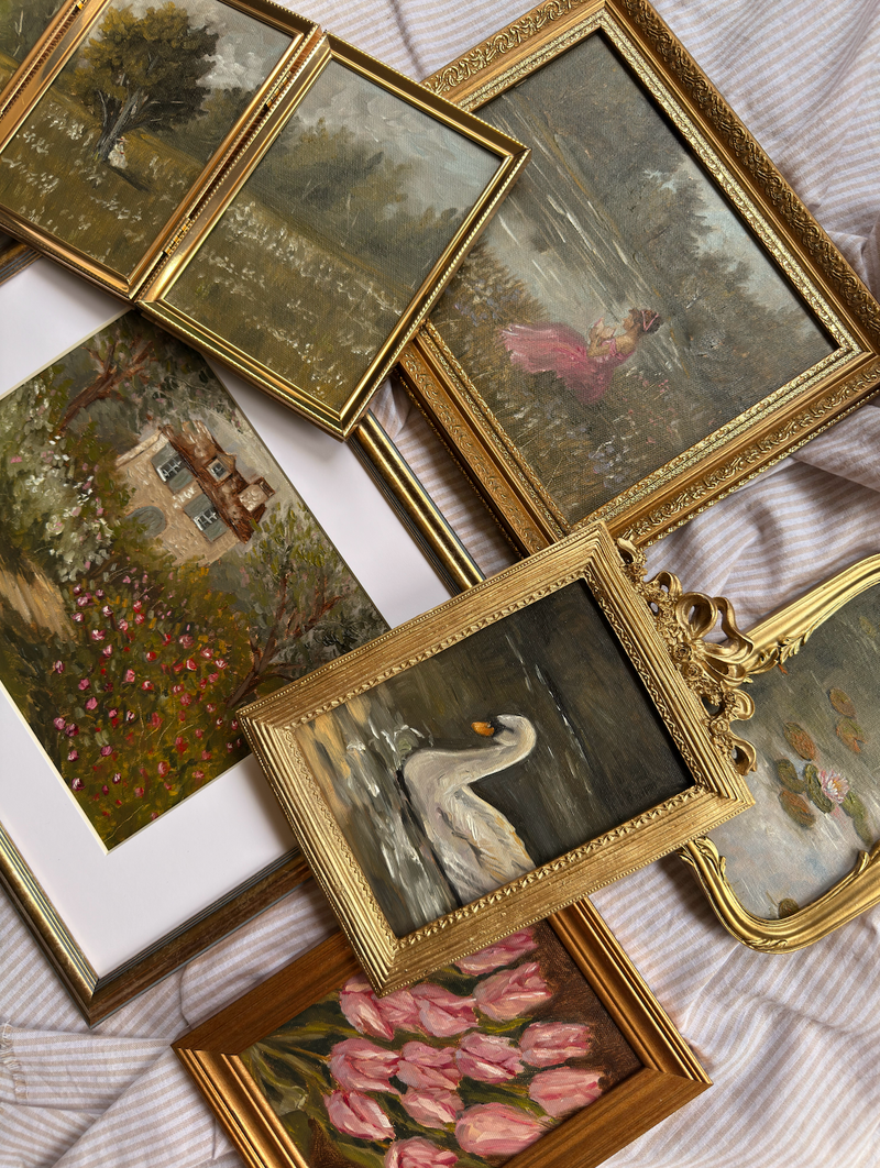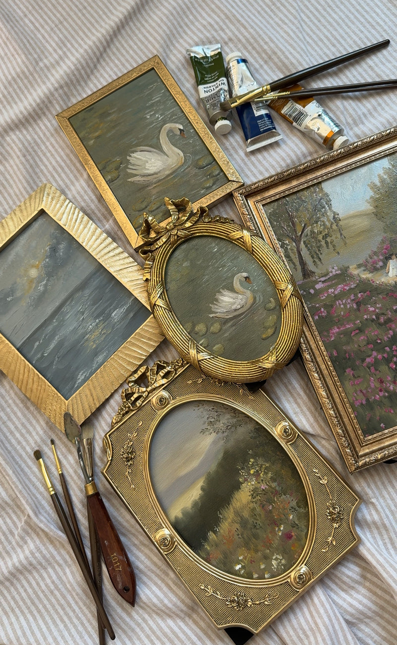 I paint with oil on canvas and pair each piece with a frame that enhances its mood and character. The frame is part of the story, adding a timeless and collected feel to every painting.